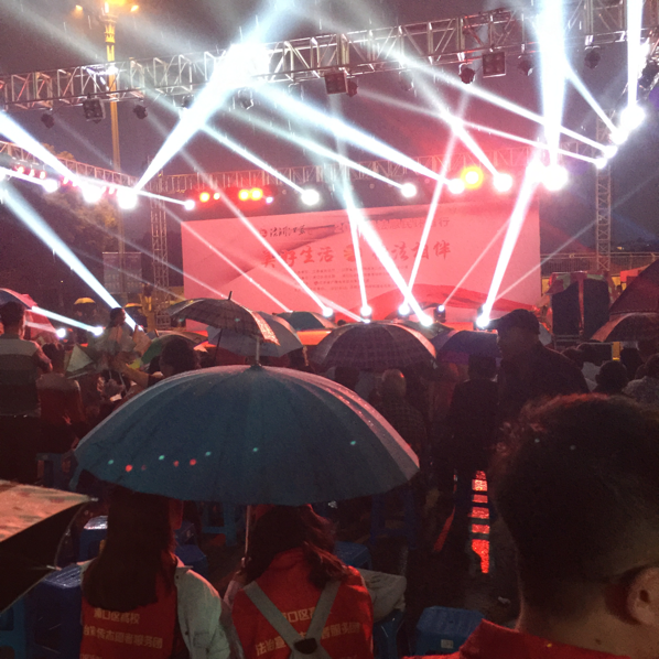 下午5时30分,我校808钱包 15级法律诊所40名志愿者到达活动场地,参加普法活动志愿工作,在现场维护秩序,帮助活动继续开展。活动即将举行的时候,下起了大雨,我校志愿者分工合作,有一部分志愿者去给摄像记者撑伞,有一部分志愿者去给下台的表演者打伞。虽然雨下的很大,但是浦口的居民们都被绚丽的舞台和动感的音乐吸引了过来,纷纷撑伞在台下等待。