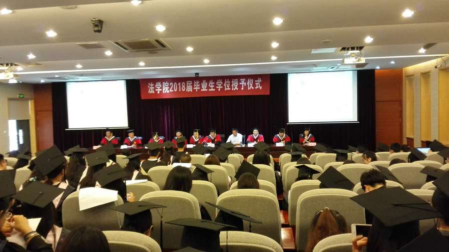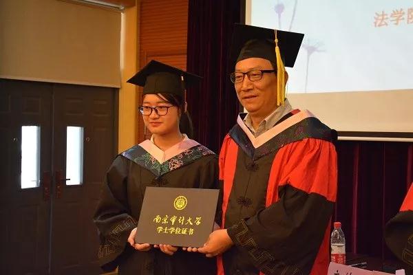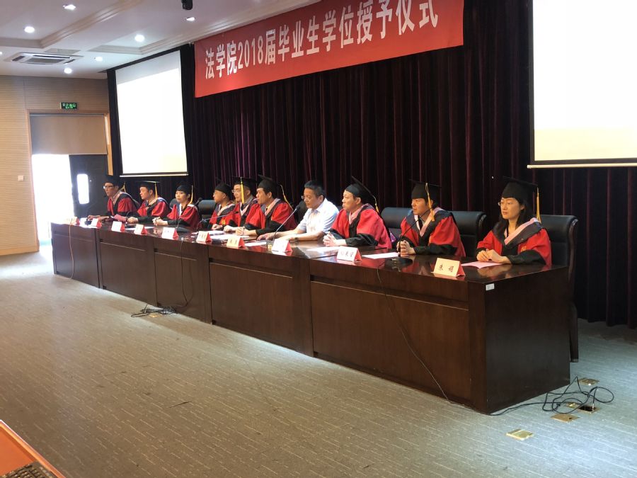 学位授予仪式上,法学学位评定委员会刘爱龙、秦国荣、何邦武、赵洲、卢小毛、秦康美、孙展望、苏欣等老师,为毕业生们授予学位,并与毕业生们合影留念。