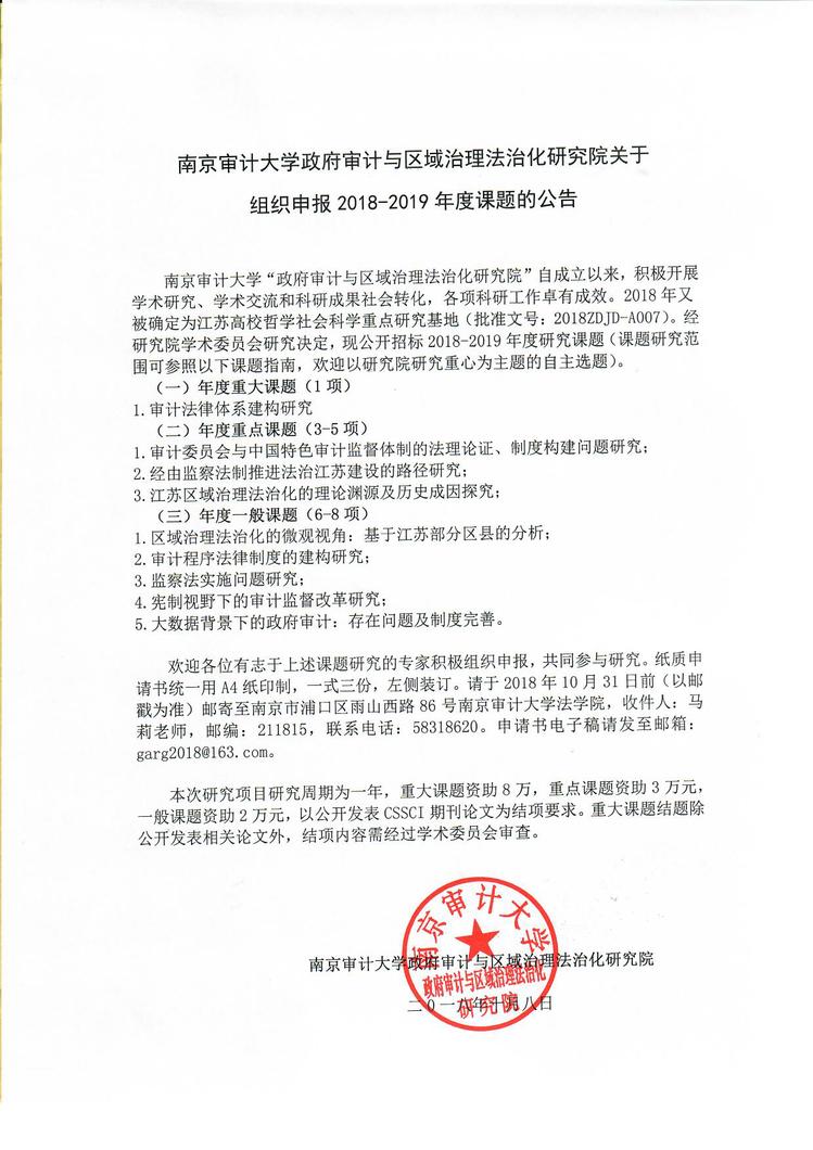 南京审计大学政府审计与区域治理法治化研究院关于组织申报2018-2019年度课题的公告