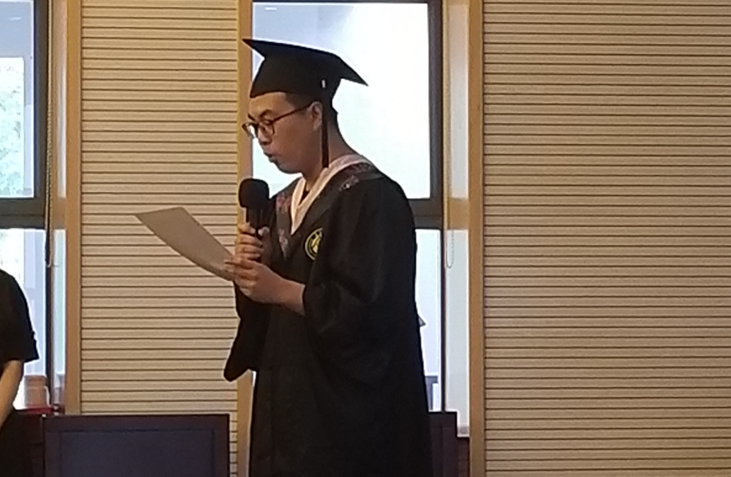 教师代表路广和殷楠两位老师发表讲话,表达了对同学们的祝福和期望。路广老师强调,文凭和学历代表着过去,只有永远奋斗的初心和善于学习的能力才能代表将来,希望同学们永远心怀梦想,勇于担当,向着幸福的方向“闻鸡起舞,登高望远,撸起袖子加油干”;无论走到哪里,母校永远是同学们的坚强后盾,母校的老师时刻关注着大家前进的脚步,808钱包 的师生永远都是血脉相连、心手相连的南审人。殷楠老师向同学们强调,教育革命的开展对老师和同学、对传统教育方式提出了新的挑战,希望同学们保持学习的热情,培养发现问题、研究问题和解决问题的能力;虽然大学已毕业,但人生的课题才开始,希望同学们用不断的学习来自我滋养,让自己可持续发展,方能成就人生的波澜壮阔。