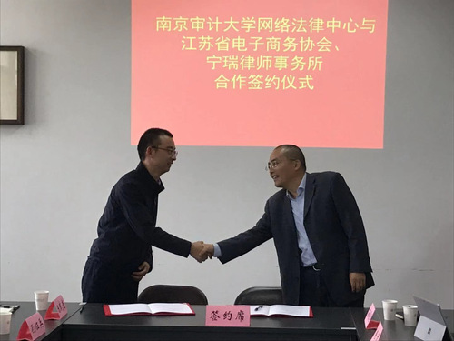 其后,何邦武副院长代表网络法律研究中心与江苏省商务厅、宁瑞律师事务所代表完成合作签约仪式 。