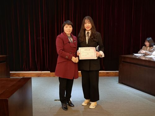 两轮环节下来,主持人宣布选手们的最终成绩并公布决赛最终结果,2018级法会1班的龚锶莹同学获得一等奖。秦康美、施卫忠、靳宁三位老师为获奖同学颁奖。