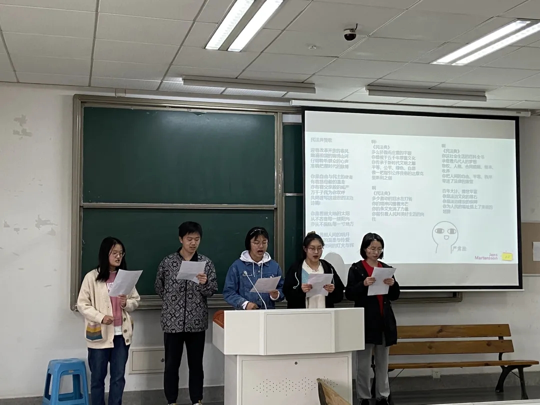 接着,杨善长老师指导的小组汇报了阅读梁慧星教授编写的《民法总论》的成果。同学们每周提出自己的问题,与小组成员和老师进行讨论,强化了同学们对民法的理解与运用能力,领略到民法上颇具前瞻性的理论观点,以及对民法典在日常生活中的应用有了更深入的理解,最后小组成员以一首诗朗诵《民法典赞歌》赞美了民法典。