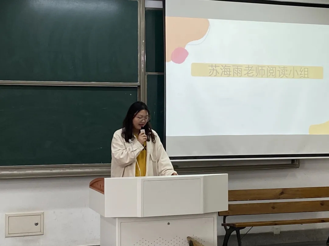 苏海雨老师指导的小组首先进行成果展,他们阅读的是《惊呆了!哲学这么好》。在苏老师带领下,同学们推开了哲学之门,从哲学家身上,明白了思考和审视自我的力量,思考给予人辨别是非的能力,审视自我能及时发现自身的不足,推动着我们向前,同学们逐渐对哲学产生了浓厚的兴趣。