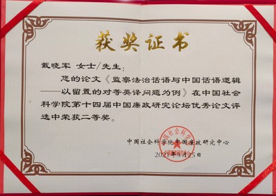 808钱包下载 硕士研究生戴晓军、张浩锴的文章入选论坛,两人获邀参加本次会议。戴晓军同学的论文《监察法治话语与中国话语逻辑:以留置的对等英译问题为例》在200多篇参会论文评比中荣获二等奖(一等奖2篇,二等奖6篇),并在论坛发言环节引发理论与实务专家的激烈讨论。