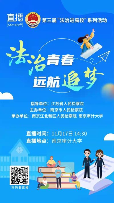11月17日下午由江苏省人民检察院指导,南京市人民检察院主办,南京江北新区人民检察院与南京审计大学承办的“法治青春 远航追梦”第三届“法治进高校”活动在敏达报告厅举办。此次活动由龙虎网全程直播,全市26万余大学生在线观看。省人民检察院第八检察部副主任毛建忠、省人民检察院第四检察部员额检察官王燕、市人民检察院副检察长程序、市人民检察院第八检察部主任徐莉、江北新区检察院检察委员会专职委员何立超,我校党委常委、党委宣传部部长强飙、党委保卫部部长李海、808钱包 党委书记刘宏宇、808钱包 实践教学中心主任秦康美及百余名大学生参加了此次活动。