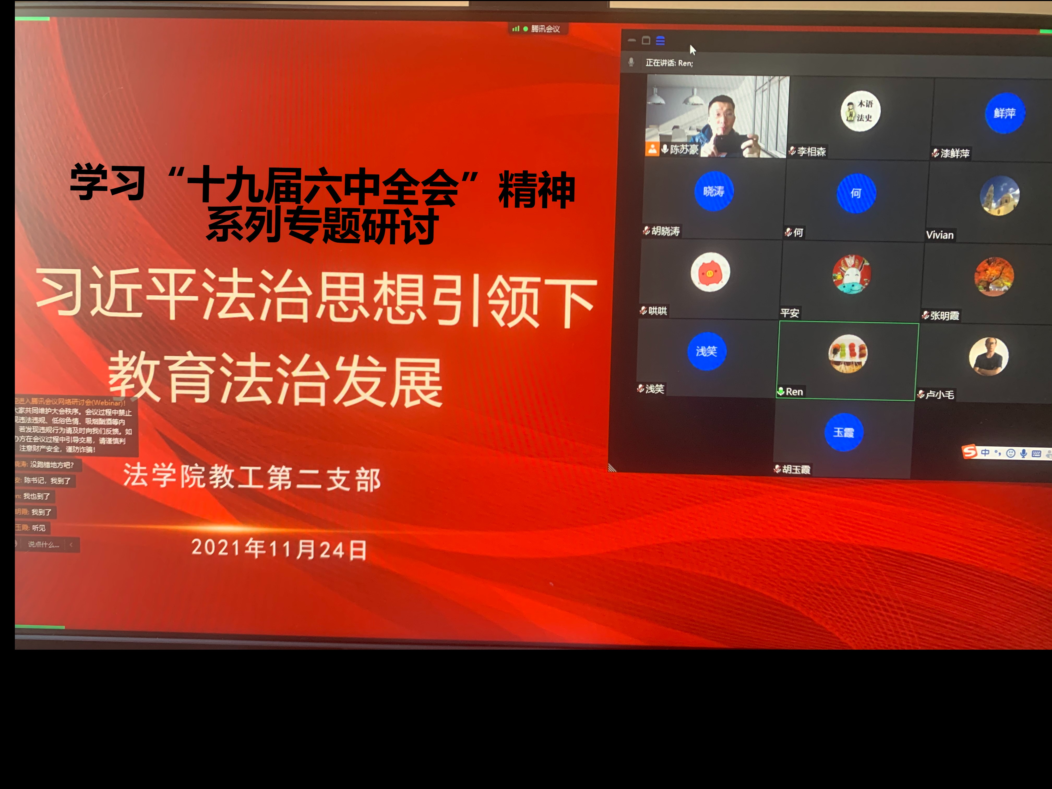 教工一支部各位党员结合自身的教学科研实践,从不同角度谈了心得体会。法理学教研室的毕少斌老师结合《中华人民共和国教育法》修改,就法学高等教育中如何贯彻习近平法治思想谈了自己的意见建议。国际法教研室的吴一鸣老师向大家分享了学习全会通过的历史性决议激动心情,认为作为一名高校教师党员,共享百年来党所取得的伟大成就,应更加坚定不移跟党走,将党的路线方针政策不折不扣地贯彻到日常教学中,去引导广大学子。同时,要更进一步结合党和国家发展中的新理论新思想来指导教学科研工作。支部书记靳宁老师从我党百年奋斗历史经验中的“坚持理论创新”出发,认为法学研究应该走出西方话语体系,关注中国现实,立足本土资源,坚持中国道路,只有这样才能真正做到“把论文写在祖国的大地上”,实现社会科学的发展繁荣。