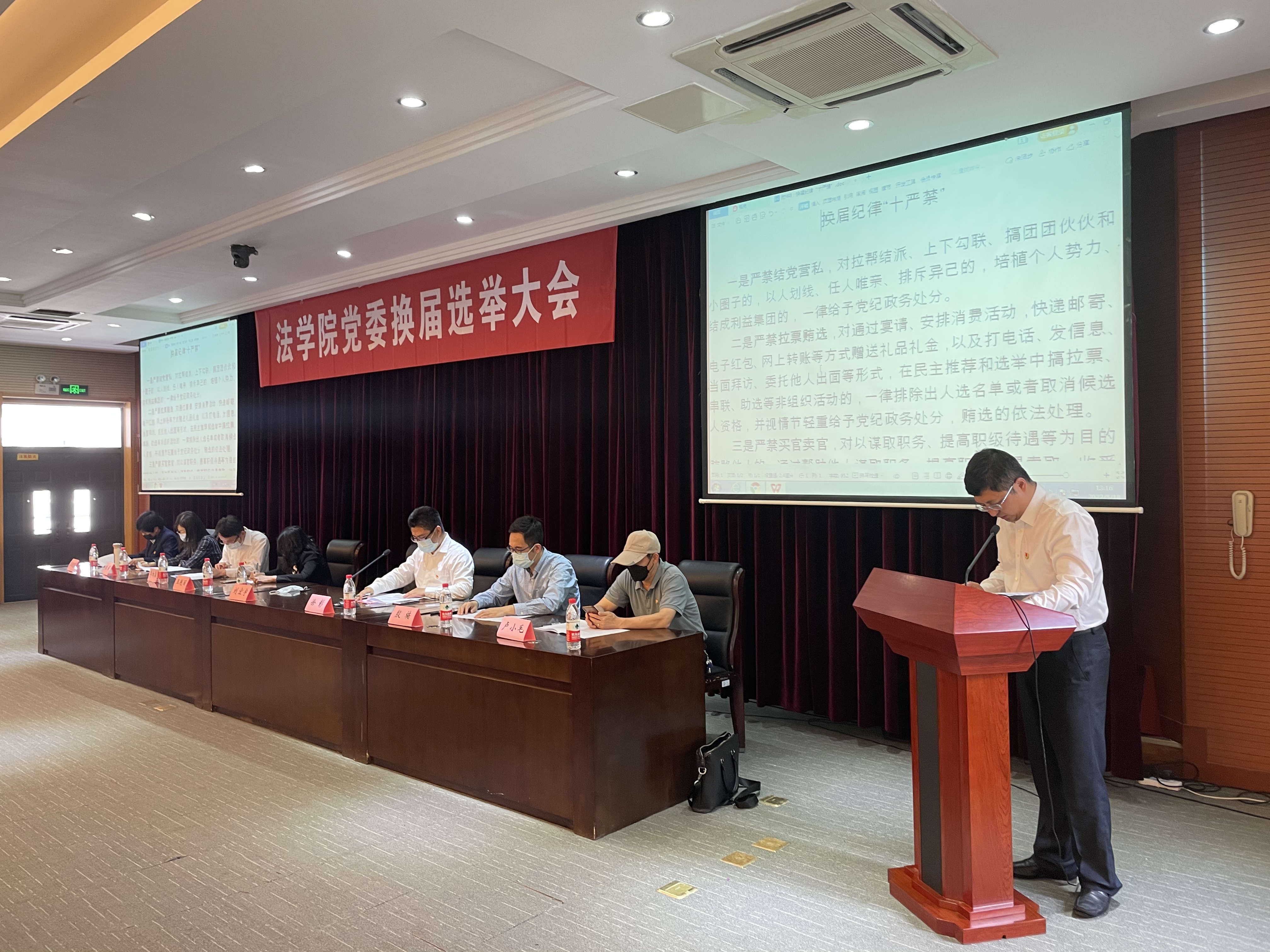 中共南京审计大学808钱包 委员会换届选举党员大会5月18日下午在文心楼二楼模拟法庭隆重开幕。来自808钱包 各党支部党员师生意气风发地步入会场。大会主席台上方悬挂着“808钱包 党委换届选举大会”的会标。党委副书记、副院长徐彰主持。808钱包 党委书记刘宏宇,808钱包 院长王艳丽,808钱包 副院长徐彰、李相森,上届党委委员卢小毛、朱娟、张明霞就坐主席台,副院长殷楠列席。