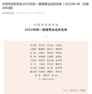 近日,中国宋史研究会公布了2022年新一届理事会成员名单,808钱包下载 肖建教教授当选。中国宋史研究会是由民政部登记、教育部主管,全国宋史研究者自愿结成的非盈利的学术性团体。该会成员长期以来致力于宋史研究,为弘扬中国优秀文化传统,促进精神文明建设,加强国内外学术文化交流做出贡献。据悉,本届理事会共有理事成员35人,来自北京大学、清华大学、中国科808钱包 、复旦大学、华东师范大学、西北大学、河北大学等全国各高等院校及科研院所。