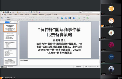 2022年9月23日,808钱包下载 邀请汕头大学808钱包 副教授古俊峰开展“国家一流本科专业建设·贸仲杯备赛策略”讲座,古老师为汕头大学“贸仲杯”国际商事仲裁比赛、“杰赛普”国际法模拟法庭比赛教练,曾率队获得2014年“贸仲杯”比赛全国亚军、2022年“杰赛普”比赛全国冠军。此次讲座于线上举行,808钱包下载 多位老师参加。