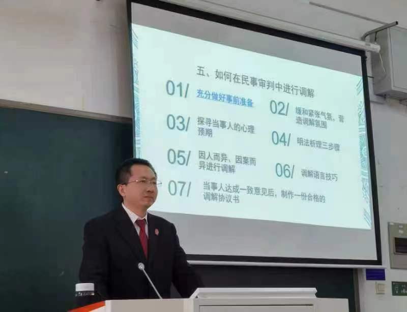课堂伊始,汪法官首先从调解的基本理论讲起,借助真实案例,介绍了调解的概念、特点以及自愿原则、合法原则、查明事实,分清是非原则等基本原则。
