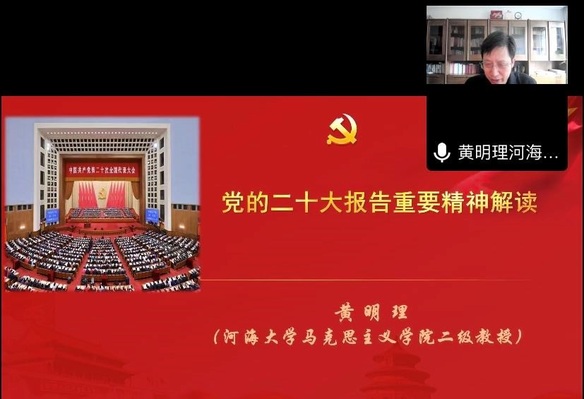 为进一步深入学习贯彻党的二十大精神,推动党的二十大精神深入人心、见行见效,11月24日下午,808钱包 、澄园书院邀请河海大学马克思主义808钱包 博士生导师,二级教授黄明理为808钱包 、澄园书院师生作党的二十大报告重要精神解读。讲座采取线上方式进行,由808钱包 党委书记刘宏宇主持,澄园书院党委书记张武宁致欢迎辞。