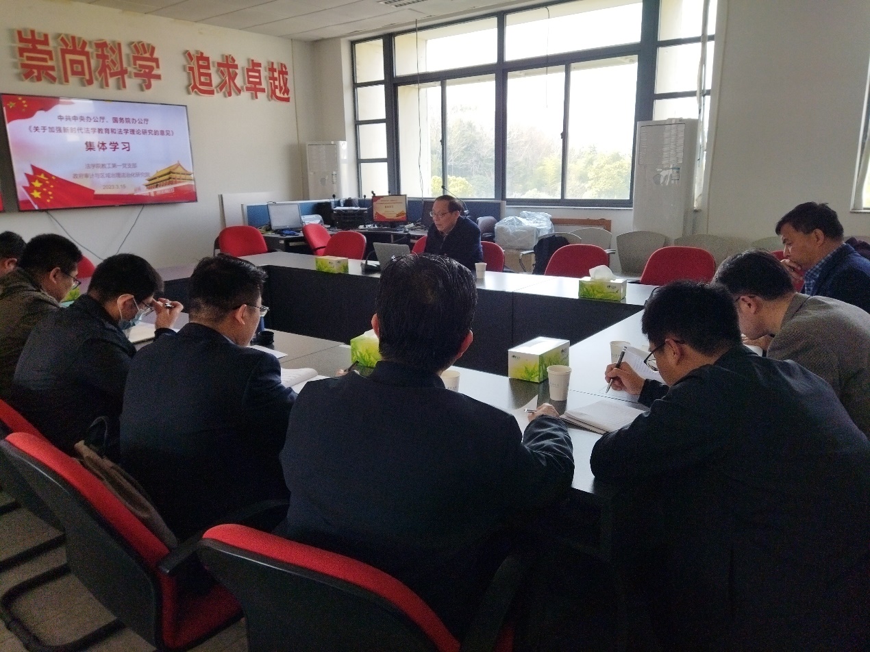 组织生活会上,全体党员首先就党的二十大精神、习近平总书记重要讲话精神、“两办”《关于加强新时代法学教育和法学理论研究的意见》精神开展集体学习,集体学习由南京审计大学原校长刘旺洪教授领学。刘旺洪教授首先介绍了《意见》出台的背景,指出当下我国法学教育与法学理论应当努力适应中国化与时代化的要求,为中国式现代化的伟大征程作出应有贡献。随后刘旺洪教授就《意见》的六个方面内容共十七条意见逐一进行了讲解。在讲解中,刘旺洪教授结合自身丰富的法学教育经验和深厚的法学理论功底,对《意见》精神进行了全面阐释,既有优化法学学科体系的宏观思考,也有结合南审法学教育实际而进行的具体问题剖析,在互联网时代的法学教育如何开展,实践教学如何深化,党内法规如何研究,法治人才的政治素质如何培育,808钱包 基层党组织活动品牌如何打造等问题上都提出了明确的建议。刘旺洪教授领学之后,何永红教授、赵永红教授、蔡金荣教授、胡天成副教授、刘宏宇书记先后发言,畅谈自己对《意见》精神的学习体会,表示要结合自身实际,找准切入点,在教学、科研、人才培养、党建工作中贯彻《意见》精神。