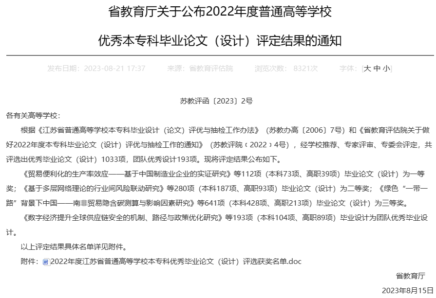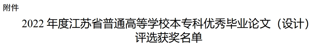 日前,江苏省教育厅公布了2022年度江苏省普通高等学校优秀本专科毕业论文(设计)评定结果。我院老师指导的毕业论文获二等奖1项,获优秀团队毕业论文(设计)1项。