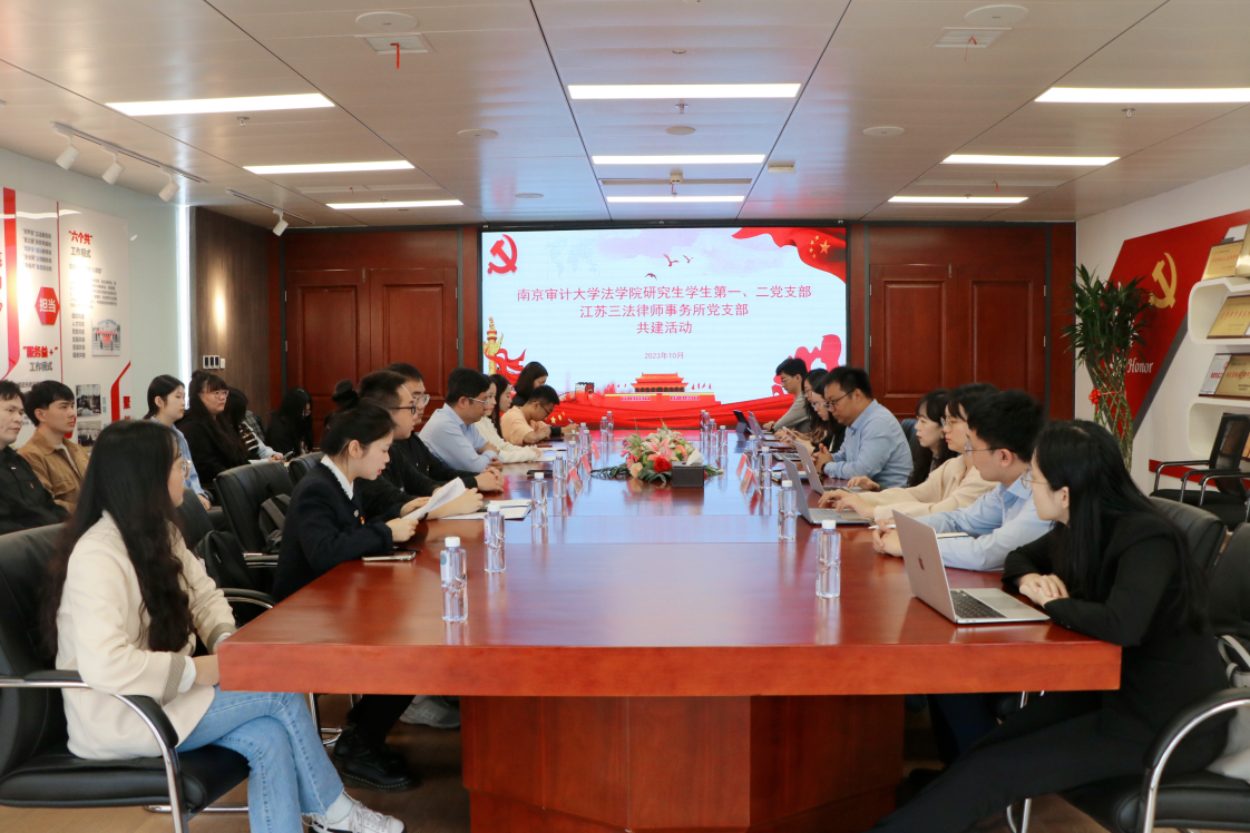 为深入学习贯彻中国共产党第二十次全国代表大会会议精神,扎实推进习近平法治思想,办好新时代法学教育,推动法学教育与法治实务相互融合发展,2023年10月27日上午,808钱包 研究生第一、二党支部与江苏三法律师事务所党支部开展共建活动。